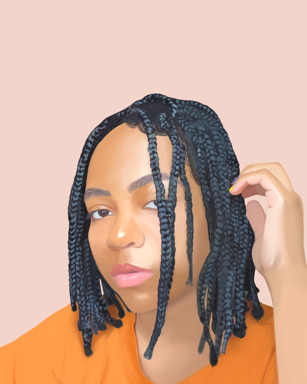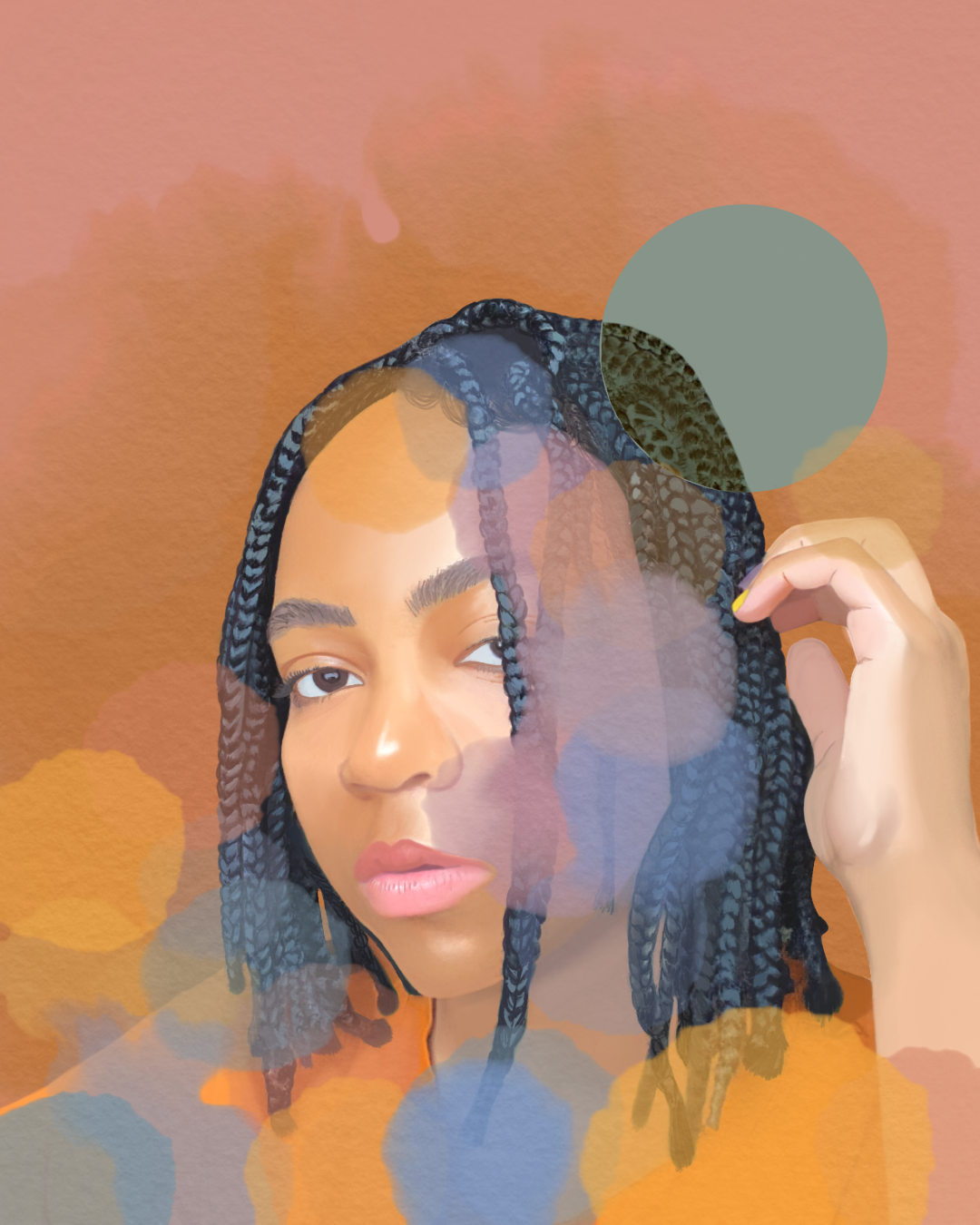 Digital realism self portrait freehanded in Adobe Sketch, utilizing a reference photo. Digitally painted and overplayed with watercolor paint for mixed medium feel.